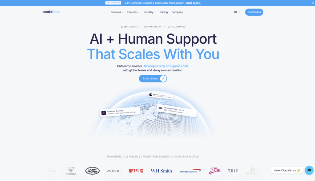 Socialbear delivers AI + Human Customer support for fast-growing and enterprise brands. By combining advanced AI with highly trained human agents, Socialbear provides always on support that is faster, smarter and lower cost than traditional outsourcing.